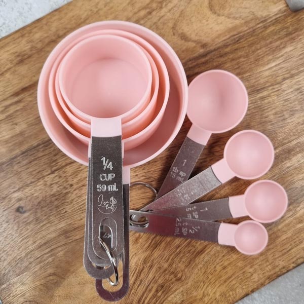 Set met 8 handige maatcups en maatlepels, geschikt voor het afmeten van ingrediënten tijdens het bakken en koken. Iedere theelepel en eetlepel is net weer anders, zo kun je alles precies afmeten. Ook kun je zo op een snelle manier Amerikaanse recepten waarbij ze cups gebruiken maken, zonder omrekenen. RVS handvat met voedselgeschikt kunststof cups. Voorzien van een ‘Lisa kookt’ logo in het RVS handvat.