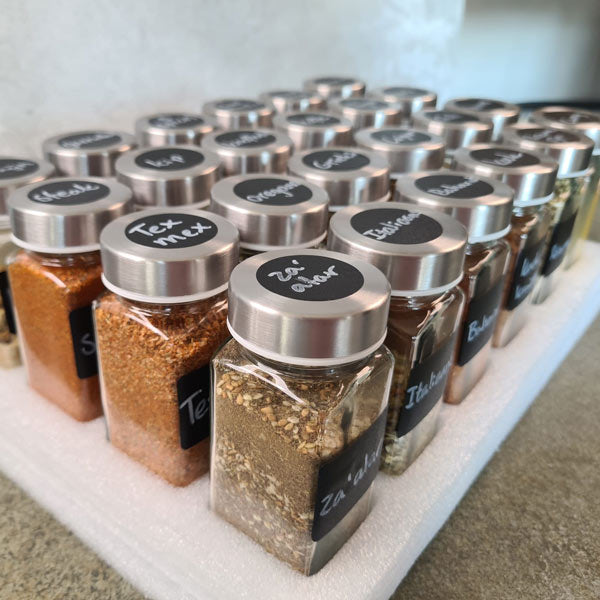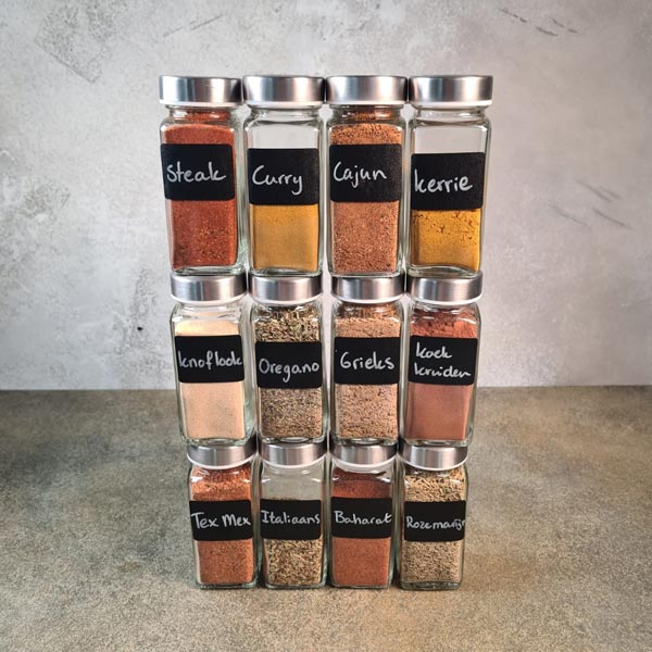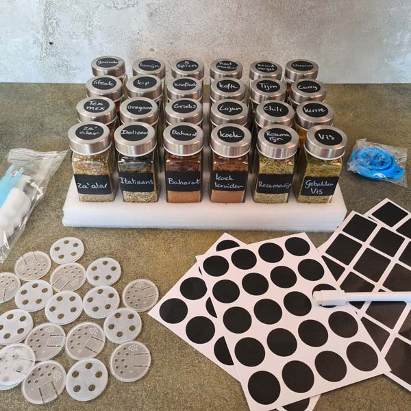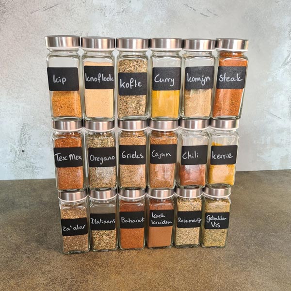 Deze kruidenpotjes zijn van glas met degelijke RVS draaideksel met verschillende strooi standen van grof tot fijn. Heel goed te organiseren door de etiketten en stickers met speciale pen die meegeleverd worden. Van voren en van boven zie je in één oogopslag welke kruidenpotje je moet pakken. Het bespaart tevens ruimte en zijn heel goed herbruikbaar en uit te breiden.