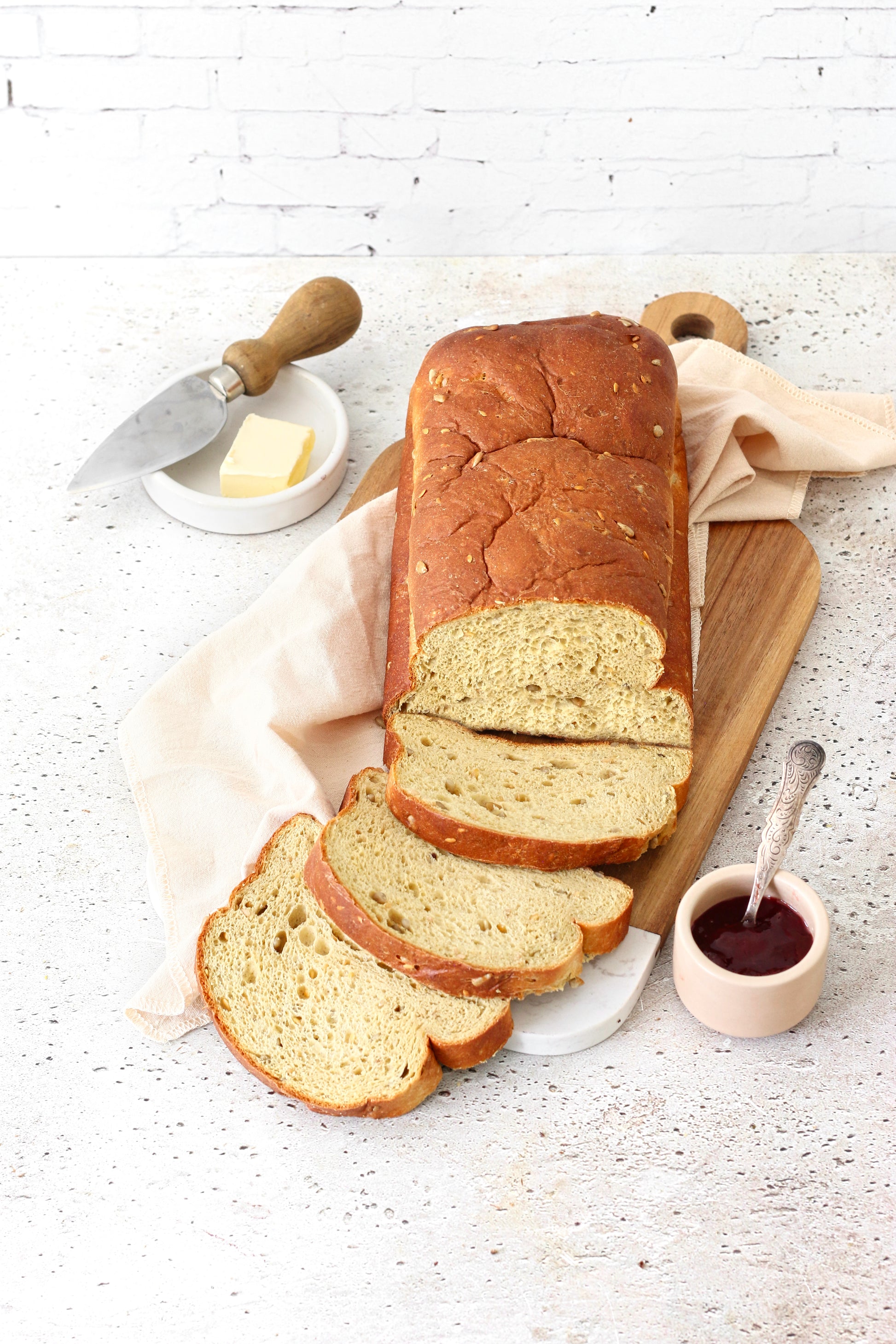 5. Verwarm de oven (hetelucht) voor op 180 graden en bak het brood in een voorverwarmde oven af, in 35-40 minuten. Laat het brood eerst afkoelen alvorens er sneetjes van te snijden.