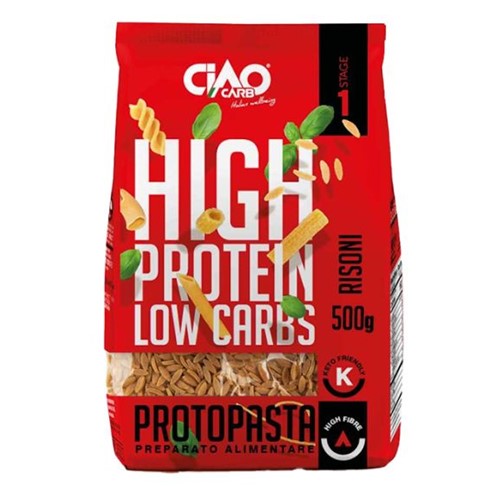 Ciao Carb Risoni rijst: Eiwit 60 g, koolhydraten 15 g, vezels 14 g