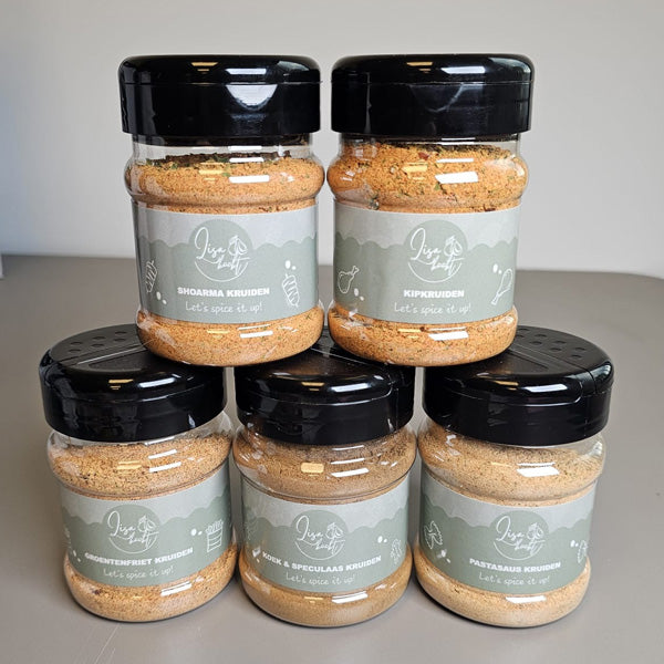 Sinds kort heeft Lisa na een aantal maanden ontwikkelen 5 nieuwe kruidenmixen toegevoegd: Speculaas, Shoarma, Kip, Groentefriet en Pastasaus kruiden om precies te zijn. Allemaal geleverd in kant en klare strooibussen van 100 gram!